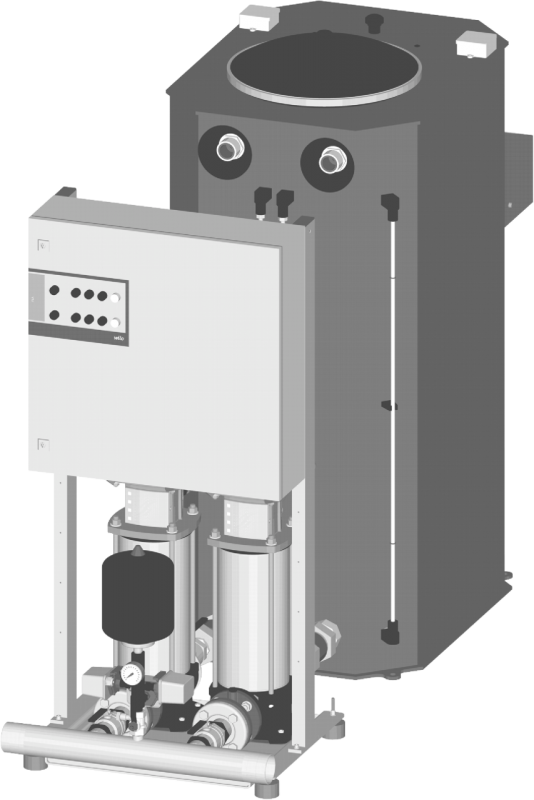 Приемный резервуар (540 л) с разрешением к применению в питьевом водоснабжении. Нормальновсасывающий вертикальный многоступенчатый высоконапорный центробежный насос из нержавеющей стали с трехфазным электродвигателем. Уплотнение вала посредством стандартного скользящего торцового уплотнения кассетного типа (насосы Helix). Мембранный напорный бак (объем 8 л), интегрированный обратный клапан, запорная арматура с всасывающей и напорной стороны (заблокирована от случайного включения), манометрический выключатель и манометр для автоматического управления установкой. В серийном исполнении с защитой насоса посредством отбора минимальных объемов через байпас, без вспомогательной энергии