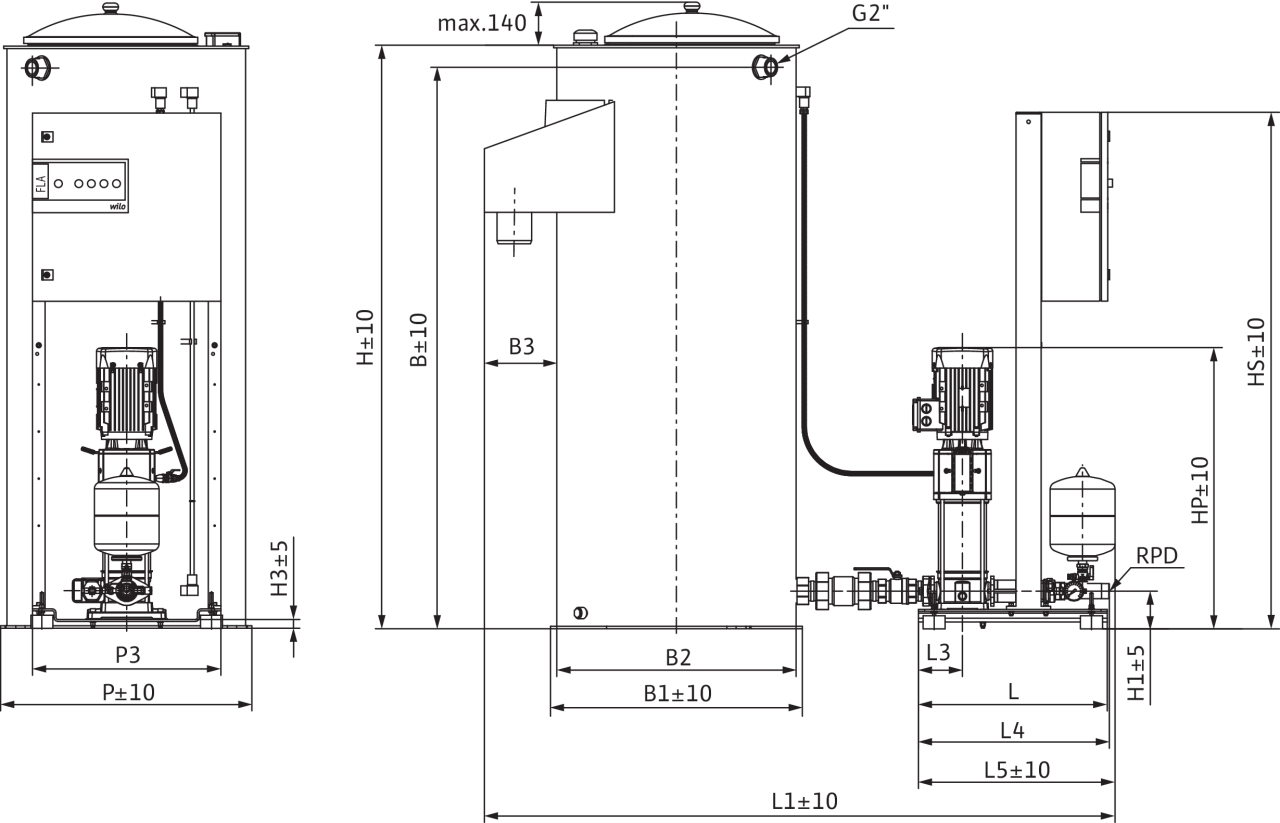 Приемный резервуар (540 л) с разрешением к применению в питьевом водоснабжении. Нормальновсасывающий вертикальный многоступенчатый высоконапорный центробежный насос из нержавеющей стали с трехфазным двигателем. Уплотнение вала посредством стандартного скользящего торцового уплотнения кассетного типа (насос Helix). Мембранный напорный бак (объем 8 л), интегрированный обратный клапан, запорная арматура с всасывающей и напорной стороны (заблокирована от случайного включения), манометрический выключатель и манометр для автоматического управления установкой. В серийном исполнении с защитой насоса посредством отбора минимальных объемов через байпас, без вспомогательной энергии