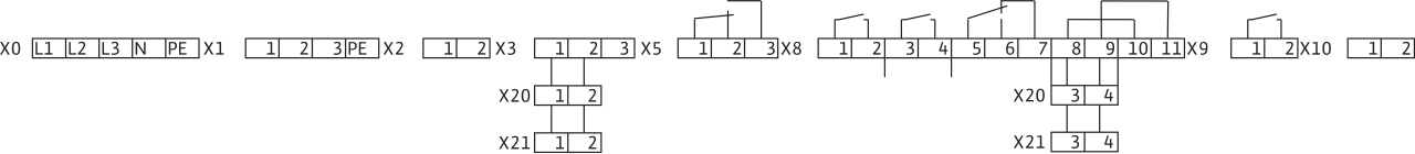 X8: беспотенциальный контакт; 1, 2 – готовность к работе; 3, 4 – вкл. насоса; 5, 6, 7 – обобщенная сигнализация неисправности; 8, 9 – соединитель X20; 10, 11 – контроль аварийного перелива (сигнализация)