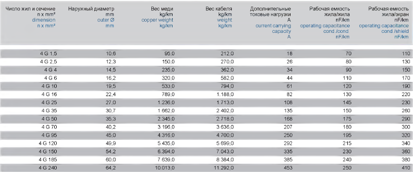 | Артикул | Название | Информация | Диаметр | Размеры | Вес меди | Вес кабеля |