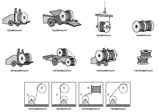 Не снимайте планки и торцевые заглушки кабеля до его укладки. В случае отрезания куска кабеля от остальной бухты надевайте торцевые заглушки обратно на кабель. Разматывание и перематывание кабелей осуществляются, как показано на рисунках. В случае перемотки кабеля с одного барабана на другой следует учитывать минимальный радиус сгибания кабеля и, следовательно, диаметр цилиндрического барабана.