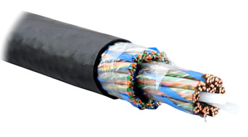 Описание конструкции Кабель состоит из двадцати пяти пронумерованных неэкранированных пучков (кабелей без оболочки), уложенных вокруг центральных силовых элементов (наполнителей) и защищенных общей внешней оболочкой из полиэтилена. Каждый внутренний пучок состоит из четырех неэкранированных витых пар, обернутых полиэстерной лентой. Для удобства разделки кабеля под внешней оболочкой предусмотрен рипкорд. Материал внешней оболочки обладает повышенной износостойкостью, устойчив к воздействию УФ излучения и низких температур.