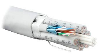 Описание конструкции Кабель категории 6А с улучшенными параметрами передачи данных. Кабель состоит из шести экранированных кабелей, уложенных вокруг центрального силового элемента (наполнителя). Каждый внутренний кабель состоит из четырех индивидуально экранированных алюминиевой фольгой витых пар, сплетенных вместе и защищенных внешней оболочкой из огнестойкого малодымного безгалогенного компаунда. Дренажный провод не предусмотрен. Конструкция защищена общей внешней оболочкой из огнестойкого малодымного безгалогенного компаунда (FR-LSZH). Параметры кабеля превосходят требования стандартов IEC 61156-5 и TIA/EIA-568-B.2-1 для категории 6А.