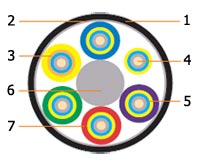 | | 1 - Внешняя оболочка 2 - Соединяющая лента 3 - Упрочняющие нити 4 - Оптическое волокно 5 - Буфер 6 - Центральный силовой элемент 7 - Оболочка миникабеля |