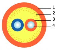 | 2 волокна: 1 - Внешняя оболочка 2 - Упрочняющие нити 3 - Буфер 4 - Оптическое волокно | |