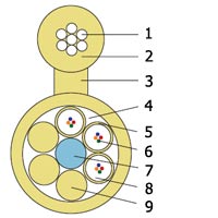 | | 1 - Несущий трос 2 - Внешняя оболочка из полиэтилена 3 - Перемычка 4 - Гидрофобный заполнитель 5 - Свободная трубка 6 - Оптическое волокно 7 - Центральный силовой элемент 8 - Заполнитель трубки 9 - Кордель |