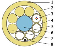 | | 1 - Внешняя оболочка из полиэтилена 2 - Гидрофобный заполнитель 3 - Оптическое волокно 4 - Свободная трубка 5 - Заполнитель трубки 6 - Центральный силовой элемент 7 - Кордель 8 - Рип-корд |