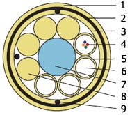 | | 1 - Внешняя оболочка из полиэтилена 2 - Гофрированная стальная броня 3 - Внутренняя оболочка из полиэтилена 4 - Оптическое волокно 5 - Свободная трубка 6 - Заполнитель трубки 7 - Центральный силовой элемент 8 - Кордель 9 - Рип-корд |