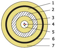 | | 1 - Внутренняя оболочка из полиэтилена 2 - Арамидные упрочняющие нити 3 - Свободная трубка 4 - Оптическое волокно 5 - Заполнитель трубки 6 - Гофрированная стальная броня 6 - Внешняя оболочка из полиэтилена |