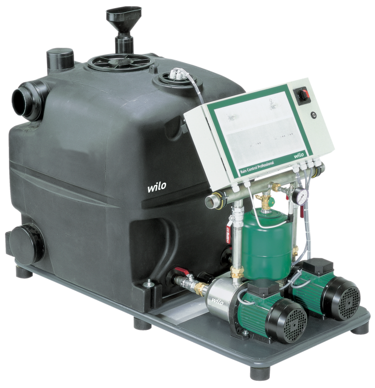 Автоматическая установка снабжения дождевой водой и дополнительной подачи пресной воды в качестве компактного модуля для коммерческой и промышленной подачи дождевой воды из подземного резервуара или цистерны с помощью погружных насосов в качестве питающих насосов (см. серию Wilo-Drain), которая состоит из двух (до четырех) нормальновсасывающих многоступенчатых горизонтальных высоконапорных центробежных насосов с крайне низким уровнем шума. Шаровой затвор со всасывающей и напорной сторон и обратный клапан на каждом насосе с системой накопительных трубопроводов с напорной стороны.