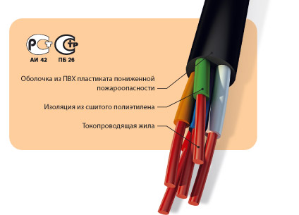Расшифровка кабеля АПвВнг: А - алюминиевая токопроводящая жила; Пв - изоляция из вулканизованного (сшитого) полиэтилена; В - оболочка из ПВХ пластиката пониженной горючести; нг(A) - не распространяет горение при групповой прокладке по категории А.