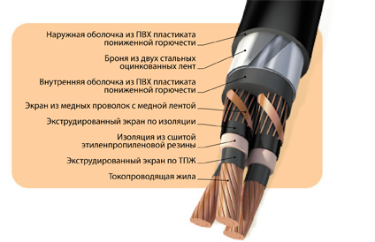 Кабали силовые с медными и алюминиевыми жилами (условное обозначение «А») с изоляцией из ЭПР, экран по изолированным жилам: