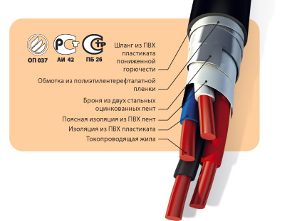 Кабель с медными жилами, с изоляцией из поливинилхлоридного пластиката, бронированный, в шланге из поливинилхлоридного пластиката пониженной горючести |
