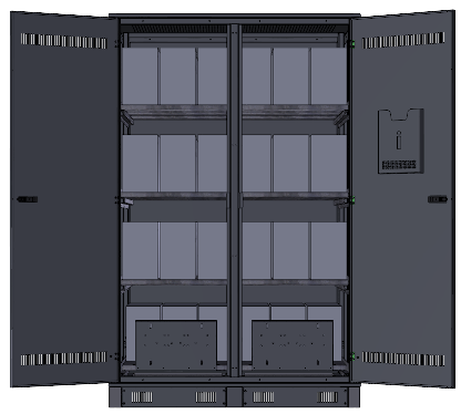 Закрывающиеся на ключ распашные двери обеспечивает защиту от несанкционированного доступа внутрь кабинета и позволяют производить монтаж без лишних усилий. Аккумуляторные кабинеты изготавливаются из листовой холоднокатаной стали и имеют порошковое полимерное покрытие корпуса. Для повышения устойчивости к окислителям, полки выполнены из оцинкованной стали.