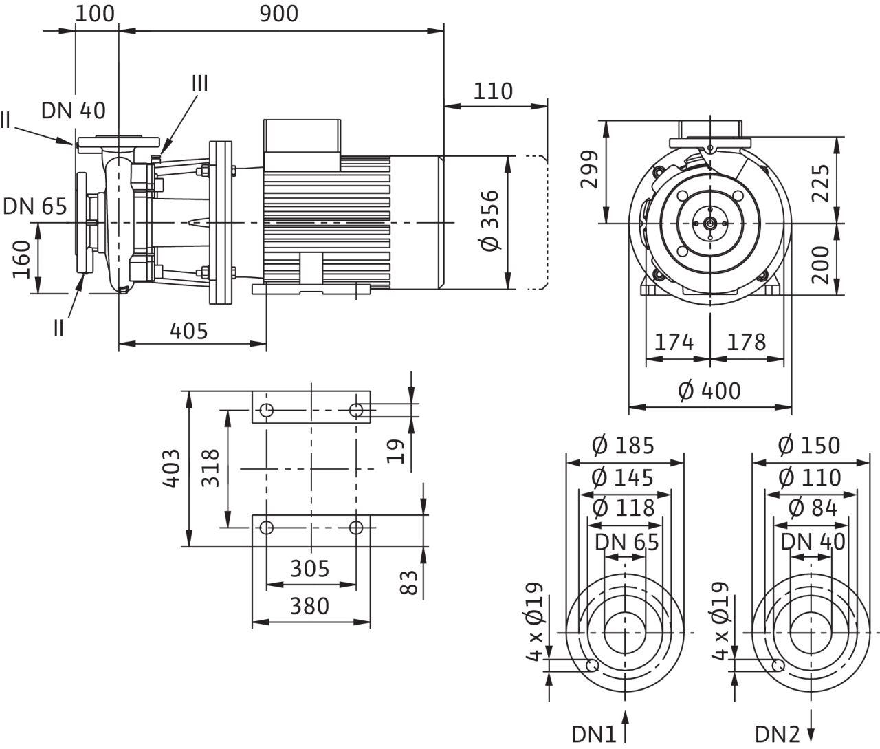 Одноступенчатый центробежный насос с сухим ротором блочного типа для установки на фундаменте. Блочное исполнение с низким уровнем шума и вибрации с промежуточным корпусом и неподвижно присоединенным унифицированным (стандартным) электродвигателем. С не зависящим от направления вращения сильфонным скользящим торцевым уплотнением (от 37 кВт/4-контактного и 45 кВт/2-контактного с картриджным торцевым уплотнением в системе Back-Pull-Out для замены скользящего торцевого уплотнения без демонтажа электродвигателя) и снижающим кавитацию рабочим колесом. Фланцы имеют штуцеры R 1/8 для измерения давления. На корпус насоса и промежуточный корпус нанесено катафорезное покрытие. Серийные электродвигатели с технологией IE3.