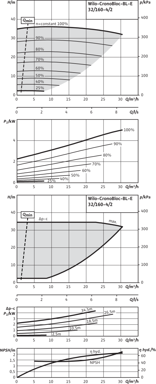 Одноступенчатый центробежный насос с сухим ротором блочного типа для установки на фундаменте со встроенным частотным преобразователем для электронного регулирования в т. ч. постоянного перепада давления (Δp-c). Насос можно эксплуатировать в режиме работы Δp-c только с внешним дифференциальным датчиком давления (комплект дифференциального датчика давления); его подключение не выполняется на корпусе насоса. Устройство CronoBloc-BL-E предназначено для перекачивания воды систем отопления (согласно VDI 2035), холодной воды и водогликолевых смесей без абразивных веществ в системах отопления, кондиционирования и охлаждения.