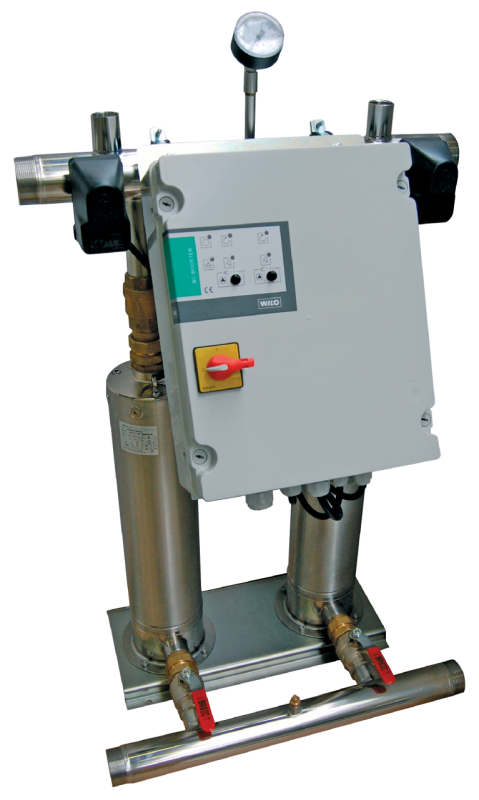 Установка повышения давления с двумя параллельными погружными насосами (подходит для монтажа за пределами воды), вертикальная, нормальновсасывающая, из нержавеющей стали, водоохлаждаемая и малошумная. Смонтирована на фундаментной раме, с комплектной системой трубопроводов, включая все гидравлические детали, центральный прибор управления, реле давления и полную кабельную прокладку.