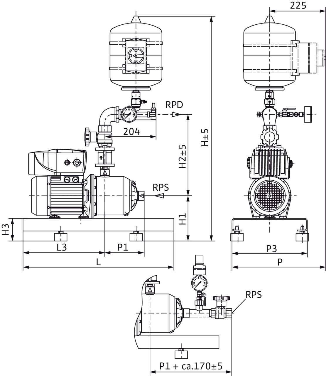 Установлена на оцинкованной фундаментной раме с регулируемой по высоте вибропоглощающей опорой; мембранный напорный бак (емкостью 8 л) с проточным оборудованием, соответствующим стандарту DIN 4807, встроенным обратным клапаном, датчиком давления (4–20 мА) и манометром для автоматического регулирования установки с функцией p = постоянное.