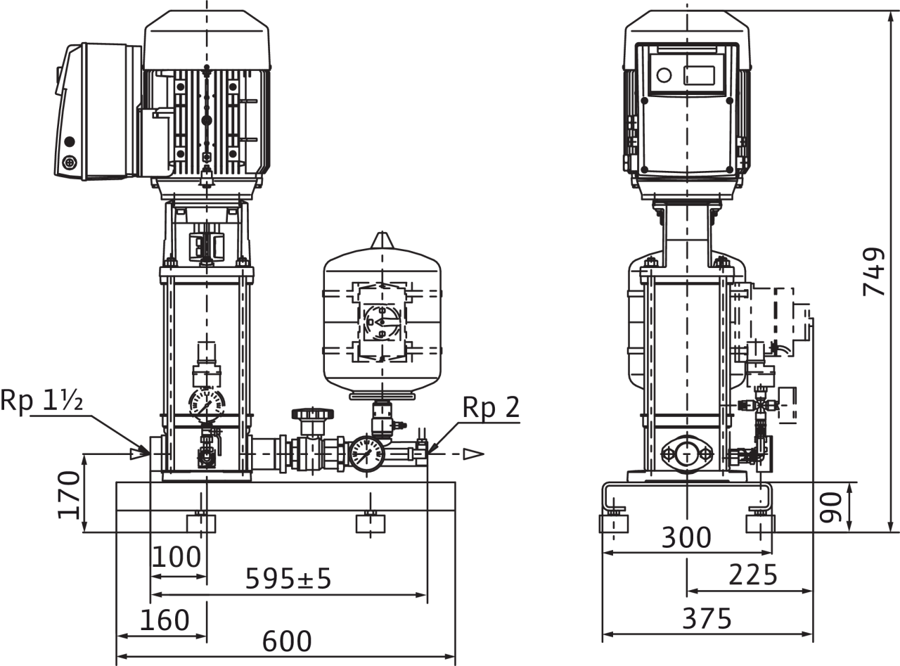Установка для водоснабжения в качестве компактной установки для повышения давления или в качестве средства водоснабжения для подключения к приемному резервуару/водопроводной сети. Состоит из: нормальновсасывающего вертикального многоступенчатого высоконапорного центробежного насоса из нержавеющей стали с электродвигателем стандарта IE2. Манжетное уплотнение посредством не зависящего от направления вращения скользящего торцового уплотнения. Электродвигатель со встроенным частотным преобразователем с воздушным охлаждением и плавной регулировкой частоты вращения от 24 Гц до макс. 60 Гц. Установлена на оцинкованной фундаментной раме с регулируемой по высоте вибропоглощающей опорой; мембранный напорный бак (емкостью 8 л) с проточным оборудованием, соответствующим стандарту DIN 4807, встроенным обратным клапаном, датчиком давления (4–20 мА) и манометром для автоматического регулирования установки с функцией p = постоянное. Бесступенчатая установка заданного значения напора одной кнопкой на частотном преобразователе. Автоматическое определение нулевой подачи и отключение насоса. Встроенное реле электродвигателя с электронным контролем тока.