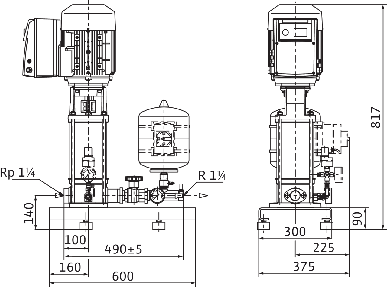 Установка для водоснабжения в качестве компактной установки для повышения давления или в качестве средства водоснабжения для подключения к приемному резервуару/водопроводной сети. Состоит из: нормальновсасывающего вертикального многоступенчатого высоконапорного центробежного насоса из нержавеющей стали с электродвигателем стандарта IE2. Манжетное уплотнение посредством не зависящего от направления вращения скользящего торцового уплотнения. Электродвигатель со встроенным частотным преобразователем с воздушным охлаждением и плавной регулировкой частоты вращения от 24 Гц до макс. 60 Гц. Установлена на оцинкованной фундаментной раме с регулируемой по высоте вибропоглощающей опорой; мембранный напорный бак (емкостью 8 л) с проточным оборудованием, соответствующим стандарту DIN 4807, встроенным обратным клапаном, датчиком давления (4–20 мА) и манометром для автоматического регулирования установки с функцией p = постоянное. Бесступенчатая установка заданного значения напора одной кнопкой на частотном преобразователе. Автоматическое определение нулевой подачи и отключение насоса. Встроенное реле электродвигателя с электронным контролем тока.