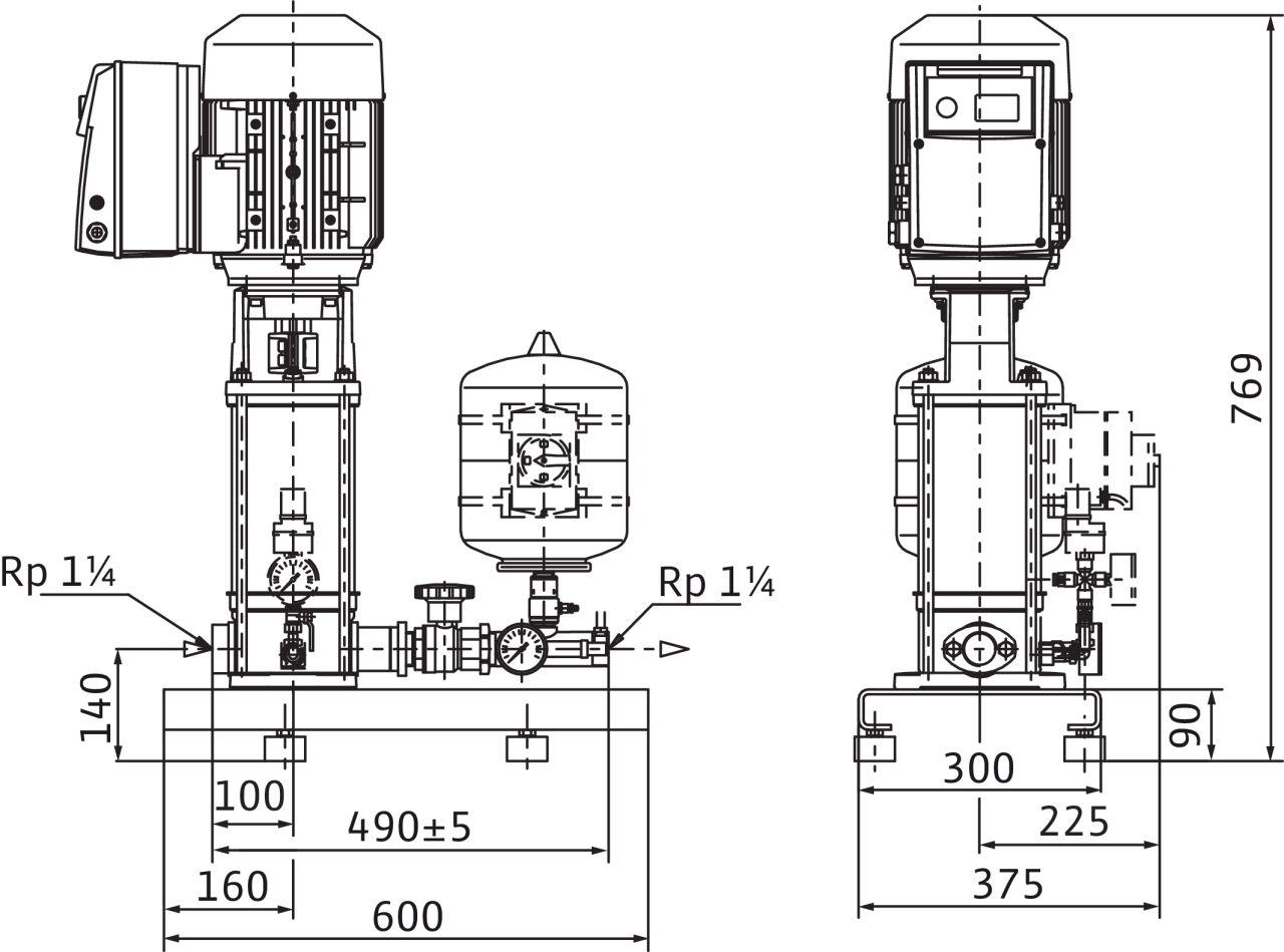 Установка для водоснабжения в качестве компактной установки для повышения давления или в качестве средства водоснабжения для подключения к приемному резервуару/водопроводной сети. Состоит из: нормальновсасывающего вертикального многоступенчатого высоконапорного центробежного насоса из нержавеющей стали с электродвигателем стандарта IE2. Манжетное уплотнение посредством не зависящего от направления вращения скользящего торцового уплотнения. Электродвигатель со встроенным частотным преобразователем с воздушным охлаждением и плавной регулировкой частоты вращения от 24 Гц до макс. 60 Гц. Установлена на оцинкованной фундаментной раме с регулируемой по высоте вибропоглощающей опорой; мембранный напорный бак (емкостью 8 л) с проточным оборудованием, соответствующим стандарту DIN 4807, встроенным обратным клапаном, датчиком давления (4–20 мА) и манометром для автоматического регулирования установки с функцией p = постоянное. Бесступенчатая установка заданного значения напора одной кнопкой на частотном преобразователе. Автоматическое определение нулевой подачи и отключение насоса. Встроенное реле электродвигателя с электронным контролем тока.