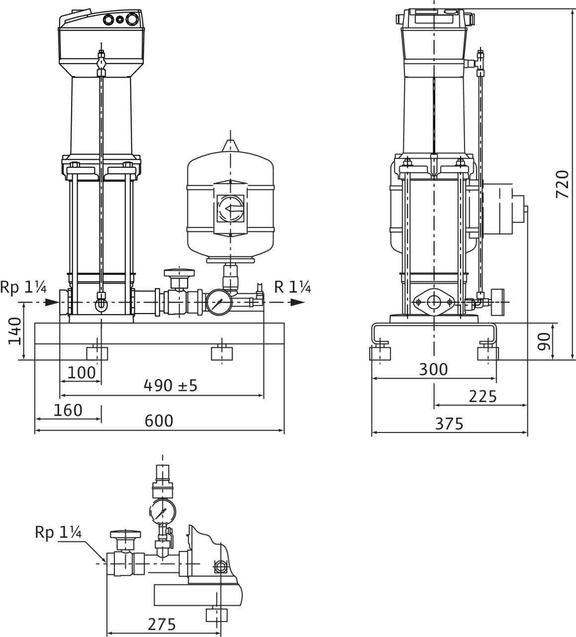 Установлена на оцинкованной фундаментной раме с регулируемой по высоте вибропоглощающей опорой; мембранный напорный бак (емкостью 8 л) с проточным оборудованием, соответствующим стандарту DIN 4807, встроенным обратным клапаном, датчиком давления (4–20 мА) и манометром для автоматического регулирования установки с функцией p = постоянное. Бесступенчатая установка заданного значения напора одной кнопкой на частотном преобразователе. Автоматическое определение нулевой подачи и отключение насоса. Встроенное реле электродвигателя с электронным контролем тока.