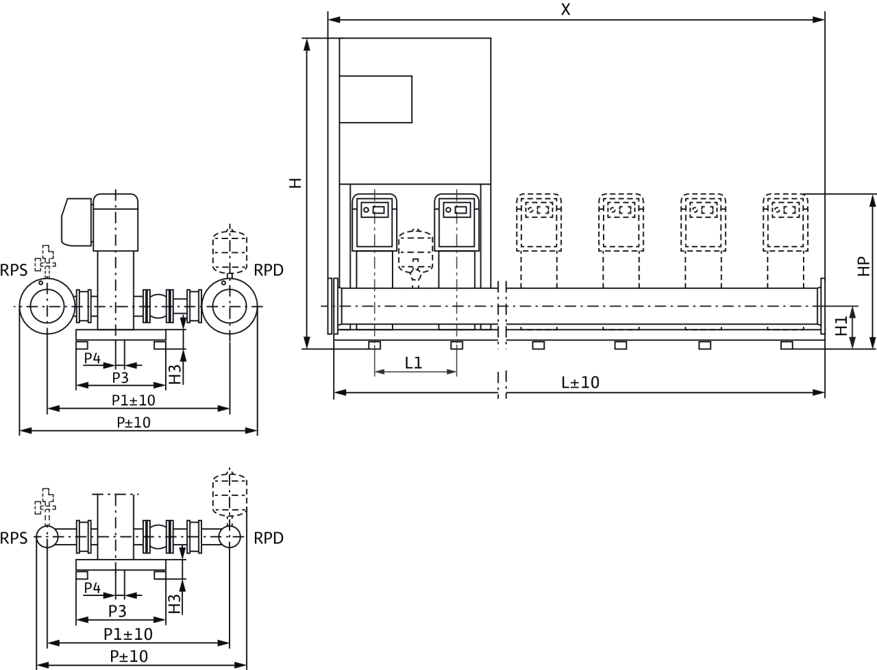 - Автоматическое, зависимое от нагрузки подключение от 1 до n насос(ов) пиковой нагрузки в зависимости от регулируемых величин давления: постоянное, p-c