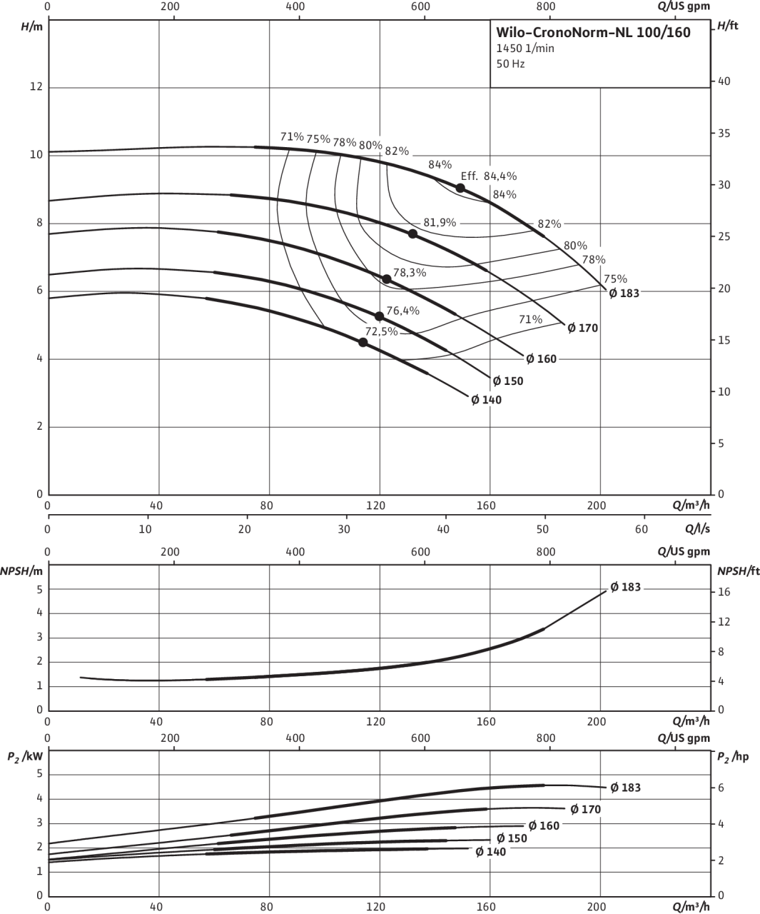 Электродвигатель IEC с 3 термодатчиками. Уплотнение вала посредством скользящего торцового уплотнения до температуры 120 В°C. Корпус из серого чугуна, вал из нержавеющей стали, рабочее колесо из серого чугуна (рабочее колесо из бронзы доступно за дополнительную плату). Электродвигатели с технологией IE3.