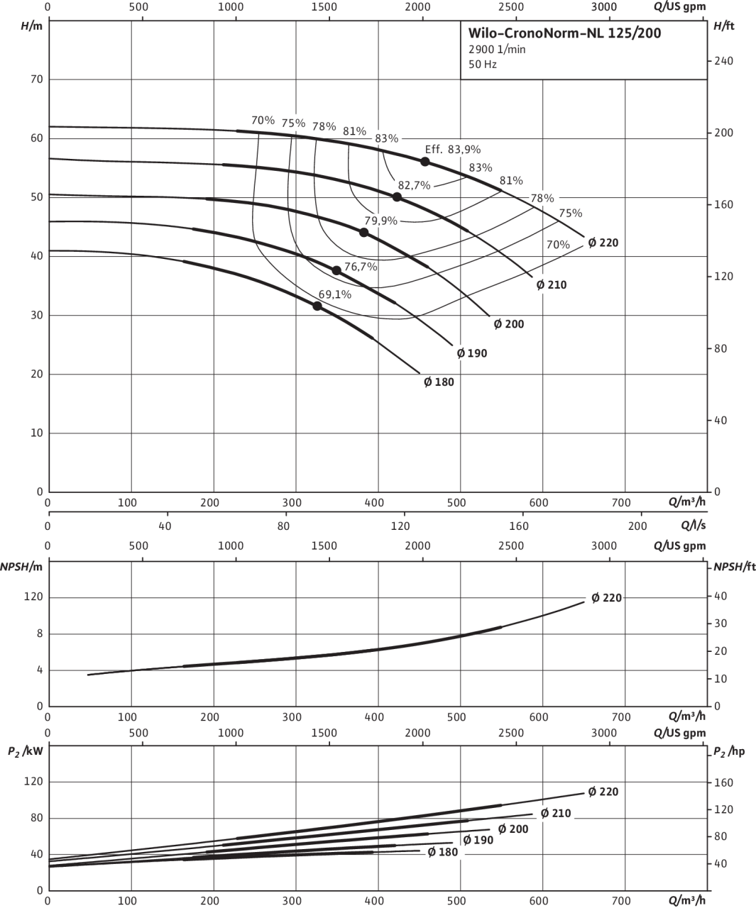 Электродвигатель IEC с 3 термодатчиками. Уплотнение вала посредством скользящего торцового уплотнения до температуры 120 В°C. Корпус из серого чугуна, вал из нержавеющей стали, рабочее колесо из серого чугуна (рабочее колесо из бронзы доступно за дополнительную плату). Электродвигатели с технологией IE3.