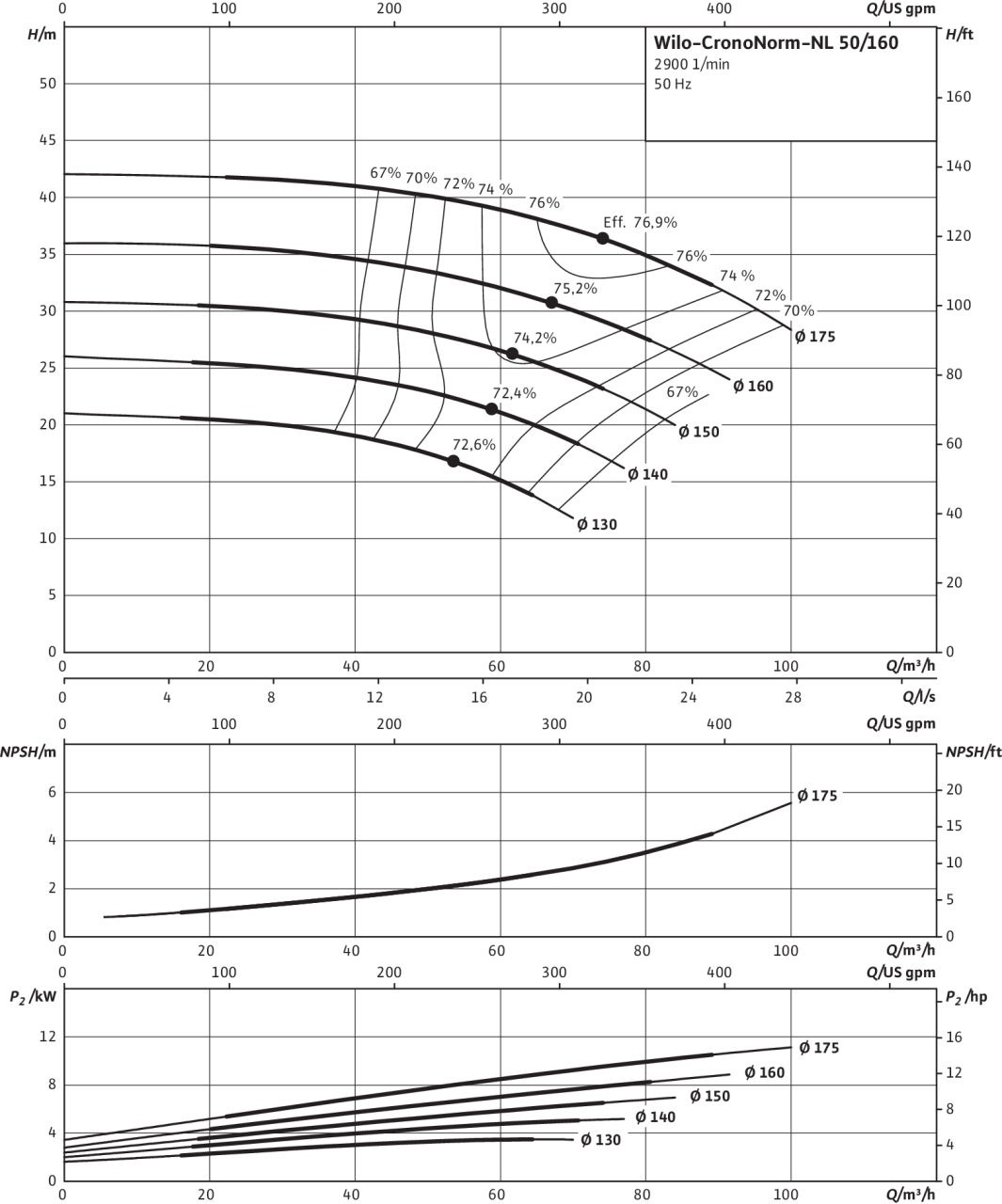 Электродвигатель IEC с 3 термодатчиками. Уплотнение вала посредством скользящего торцового уплотнения до температуры 120 В°C. Корпус из серого чугуна, вал из нержавеющей стали, рабочее колесо из серого чугуна (рабочее колесо из бронзы доступно за дополнительную плату). Электродвигатели с технологией IE3.