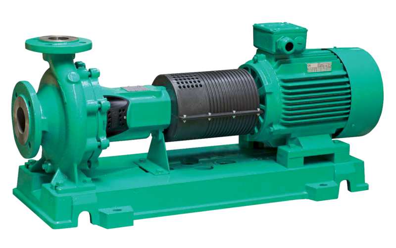 Одноступенчатый центробежный насос в качестве насоса на опорной раме согласно стандарту EN 733, с осевым всасывающим патрубком и радиальным напорным патрубком, для установки на фундаменте. Насос с опорой и прифланцованной опорой подшипника, упругой муфтой/съемной муфтой (за дополнительную плату), кожухом муфты и электродвигателем, установленными на общей опорной раме.
