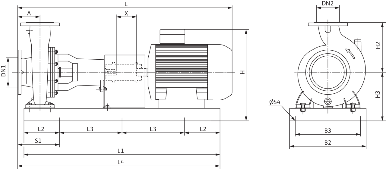 Одноступенчатый центробежный насос в качестве насоса на опорной раме. С аксиальным всасывающим патрубком и радиальным напорным патрубком, для установки на фундамент. Насос с опорой и прифланцованной опорой подшипника, упругой съемной муфтой, кожухом муфты и электродвигателем, установленными на общей опорной раме.