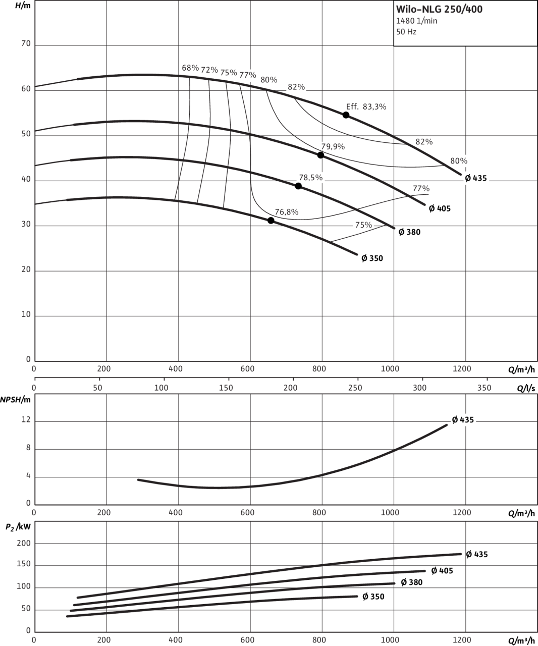 Электродвигатель IEC с 3 термодатчиками. Уплотнение вала посредством скользящего торцового уплотнения до температуры 120 В°C. Корпус из чугуна с шаровидным графитом, вал из нержавеющей стали, рабочее колесо из серого чугуна (рабочее колесо из бронзы доступно за дополнительную плату). Электродвигатели с технологией IE3.
