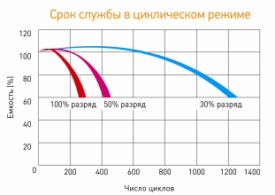 буферном режиме 8 лет, в циклическом - 280 циклов при 100% глубине разряда.