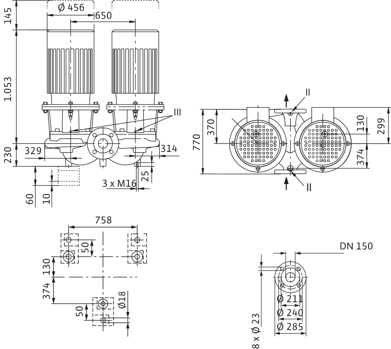 Технический паспорт Характеристики 4-полюсный – работа одного насоса Габаритный чертеж II отверстие для измерения давления R 1 / 8 ; III удаление воздуха R 1 / 8 Схема подключения Δ: Схема соединения – треугольник Y: Схема соединения...