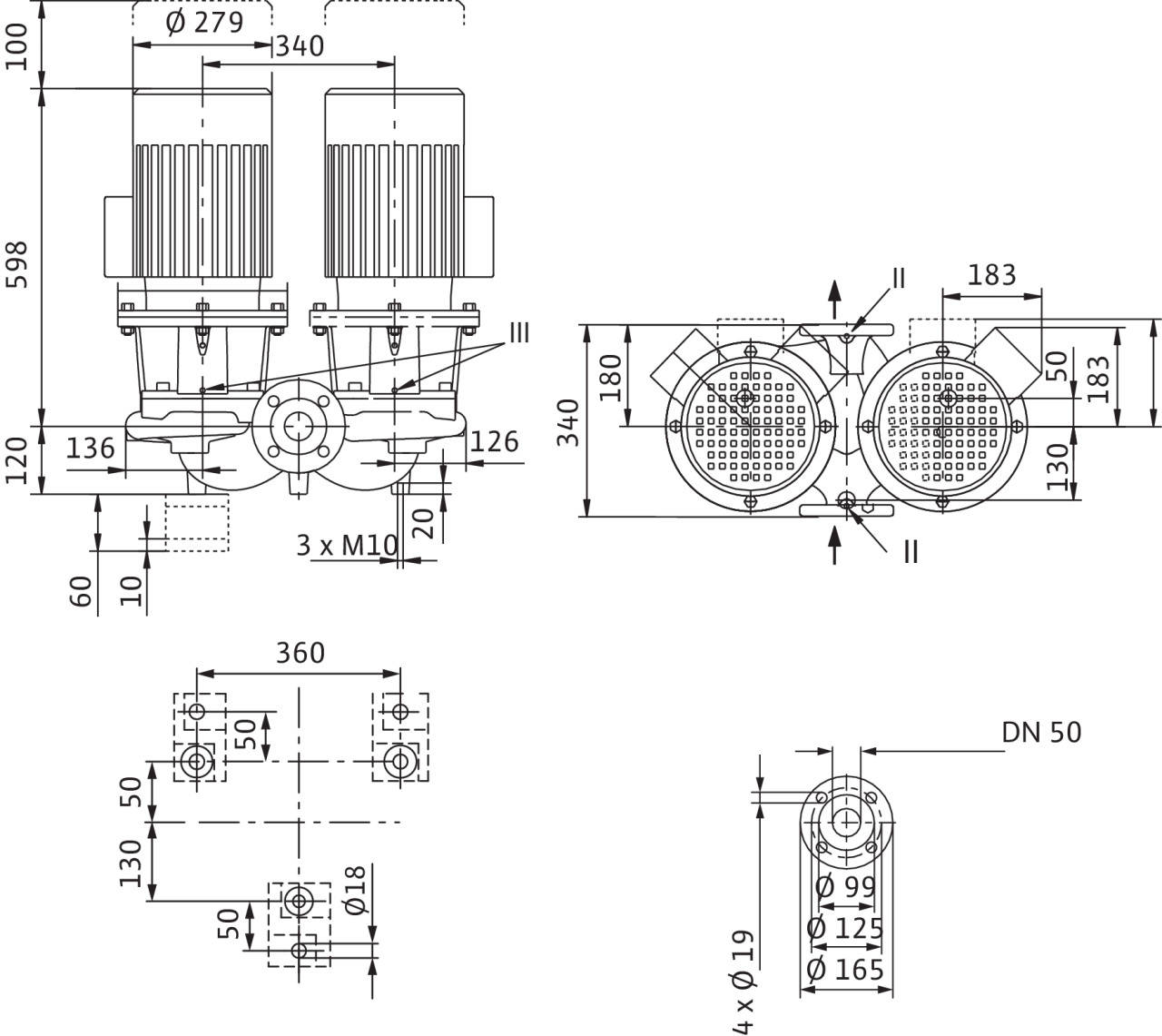 Технический паспорт Характеристики 2-полюсный – работа одного насоса Габаритный чертеж II отверстие для измерения давления R 1 / 8 ; III удаление воздуха R 1 / 8 Схема подключения Δ: Схема соединения – треугольник Y: Схема соединения...