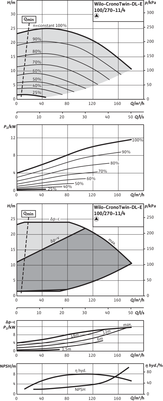 Технический паспорт Характеристики 4-полюсный, работа одного насоса Допустимая перекачиваемая среда (другие среды по запросу) Вода систем отопления (согласно VDI 2035) • Водогликолевая смесь (при доле гликоля 20-40 об. % и температуре перекачиваемой...