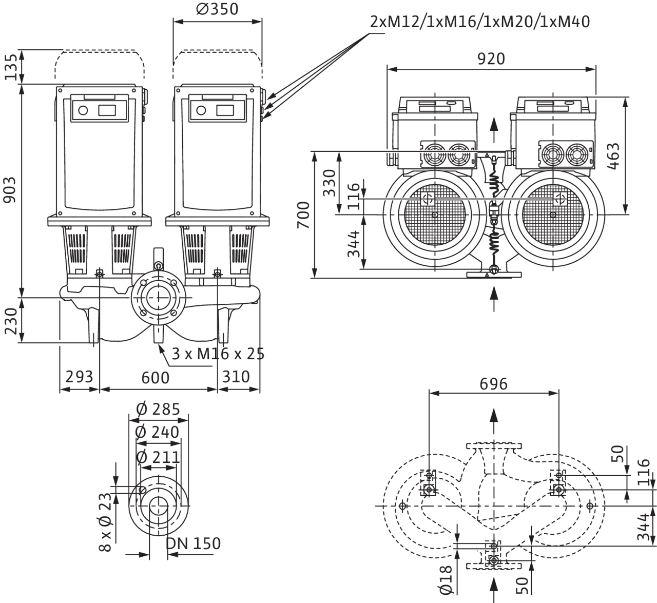 • Спиральный корпус линейного исполнения (всасывающий и напорный патрубок с одинаковыми фланцами в одной линии), фланец PN 16 – с отверстием согласно EN 1092-2