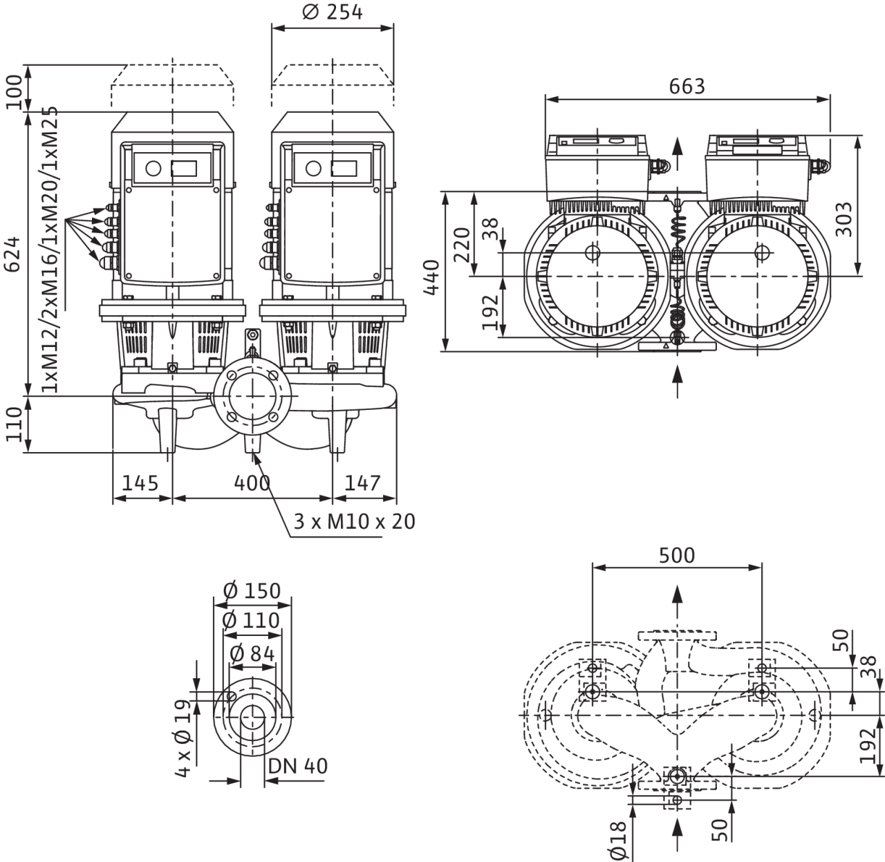 Сдвоенный насос с сухим ротором линейного типа для установки в трубах или на фундаменте со встроенным частотным преобразователем для электронного регулирования параметров, в том числе постоянного или переменного перепада давления (Δp-c/Δp-v).