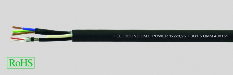 Гибридный кабель HELUSOUND® DMX+POWER объединяет в себе экранированный кабель управления освещением и кабель сетевого питания. DMX-кабель, экранированный оплеткой из луженой меди, оптимально подходит для управления систем освещения и микшерных пультов (волновое сопротивление 110 Ом). Он отличается мягкой PVC-оболочкой и предназначен как для внутренней, так и для внешней прокладки. Кроме того, DMX-кабель может применяться для передачи аудиосигналов, например, в качестве микрофонного кабеля или питающего кабеля для активных систем динамиков.