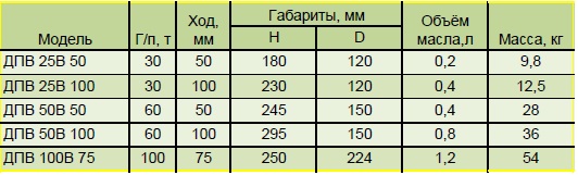 Характеристики — Домкраты ДПВ 25В 50,ДПВ 25В 100,ДПВ 50В 50,ДПВ 50В 100,ДПВ 100В 75.Полый поршень. Возврат пружиной.