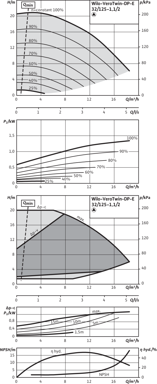 Технический паспорт Характеристики Работа одного насоса Допустимая перекачиваемая среда (другие среды по запросу) Вода систем отопления (согласно VDI 2035) • Водогликолевая смесь (при доле гликоля 20-40 об. % и температуре перекачиваемой...