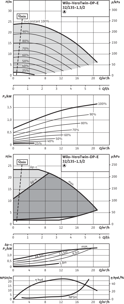 Технический паспорт Характеристики Работа одного насоса Допустимая перекачиваемая среда (другие среды по запросу) Вода систем отопления (согласно VDI 2035) • Водогликолевая смесь (при доле гликоля 20-40 об. % и температуре перекачиваемой...
