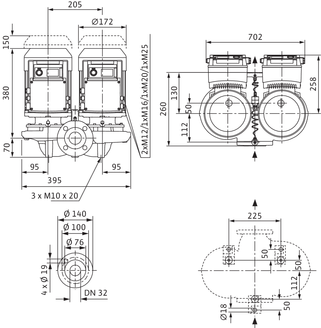 Сдвоенный насос с сухим ротором линейного типа для установки в трубах или на фундаменте со встроенным частотным преобразователем для электронного регулирования параметров, в том числе постоянного или переменного перепада давления (Δp-c/Δp-v). Трехфазный электродвигатель с частотным преобразователем
