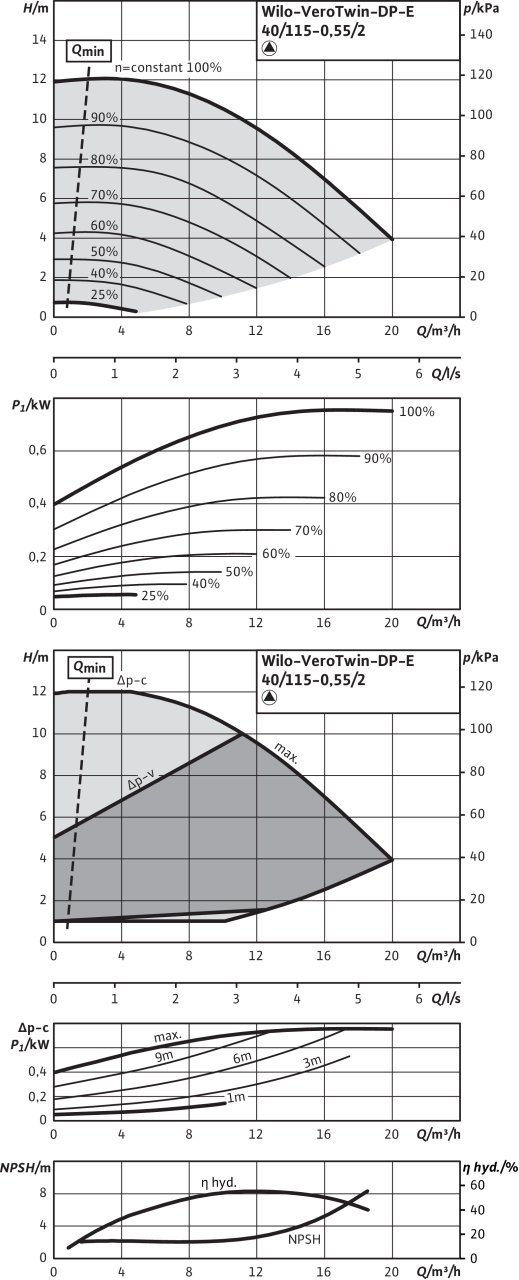 Технический паспорт Характеристики Работа одного насоса Допустимая перекачиваемая среда (другие среды по запросу) Вода систем отопления (согласно VDI 2035) • Водогликолевая смесь (при доле гликоля 20-40 об. % и температуре перекачиваемой...