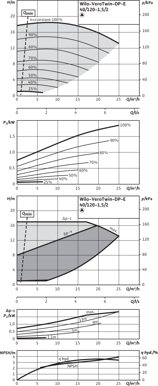 Технический паспорт Характеристики Работа одного насоса Допустимая перекачиваемая среда (другие среды по запросу) Вода систем отопления (согласно VDI 2035) • Водогликолевая смесь (при доле гликоля 20-40 об. % и температуре перекачиваемой...