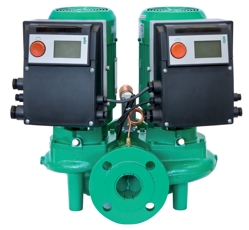Сдвоенный насос с сухим ротором линейного типа для установки в трубах или на фундаменте со встроенным частотным преобразователем для электронного регулирования параметров, в том числе постоянного или переменного перепада давления (Δp-c/Δp-v). Трехфазный электродвигатель с частотным преобразователем