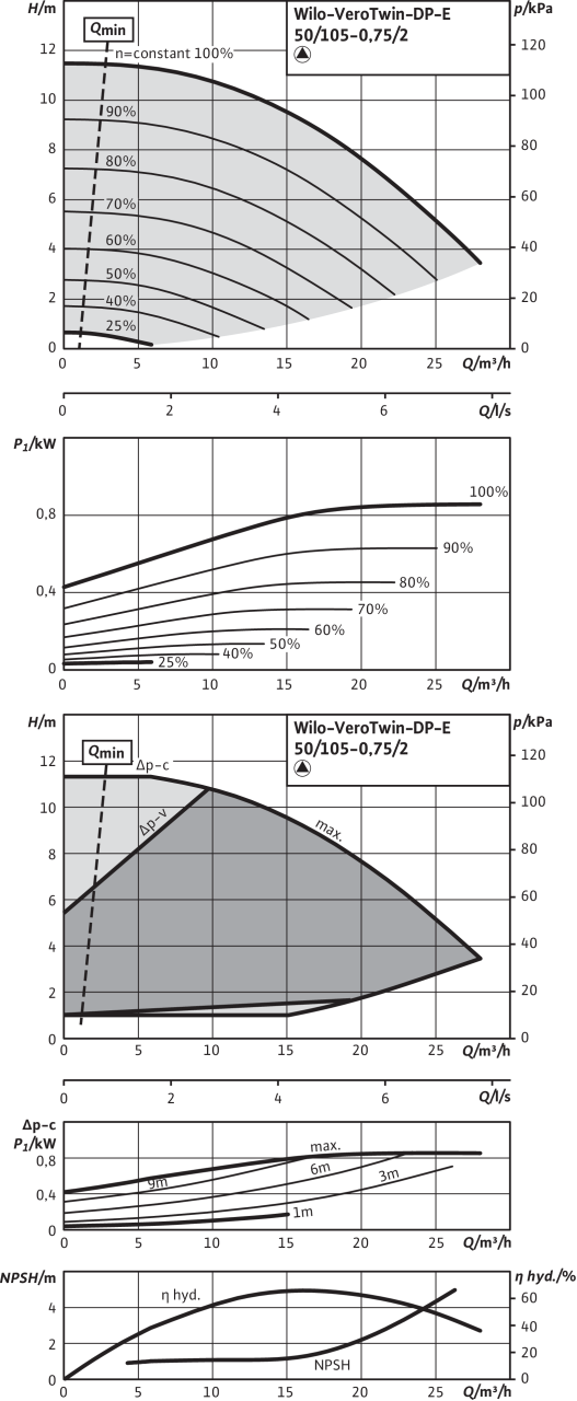 Технический паспорт Характеристики Работа одного насоса Допустимая перекачиваемая среда (другие среды по запросу) Вода систем отопления (согласно VDI 2035) • Водогликолевая смесь (при доле гликоля 20-40 об. % и температуре перекачиваемой...