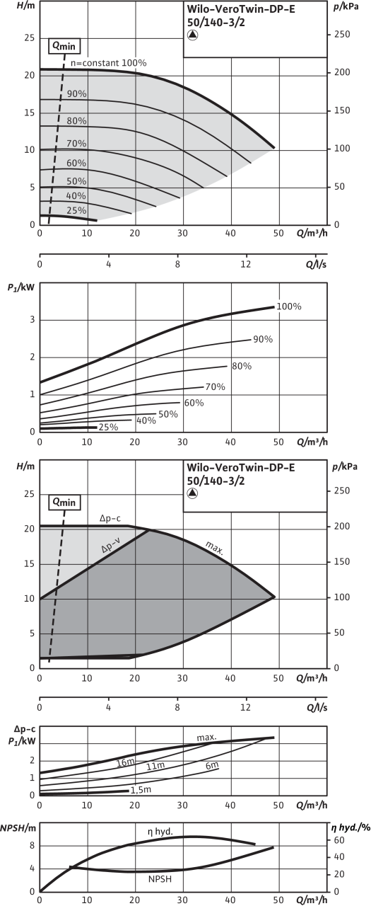 Технический паспорт Характеристики Работа одного насоса Допустимая перекачиваемая среда (другие среды по запросу) Вода систем отопления (согласно VDI 2035) • Водогликолевая смесь (при доле гликоля 20-40 об. % и температуре перекачиваемой...