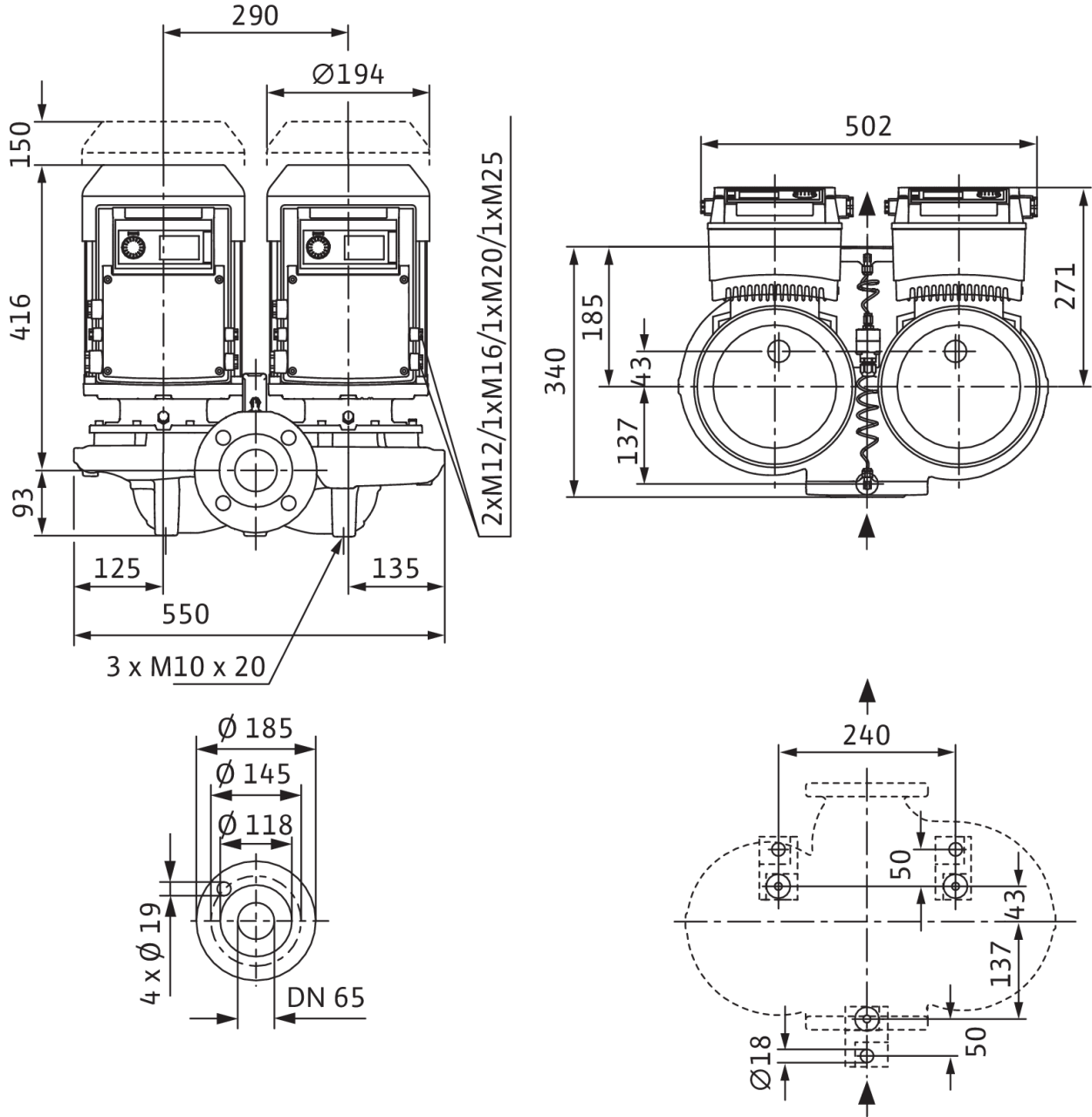 Сдвоенный насос с сухим ротором линейного типа для установки в трубах или на фундаменте со встроенным частотным преобразователем для электронного регулирования параметров, в том числе постоянного или переменного перепада давления (Δp-c/Δp-v). Трехфазный электродвигатель с частотным преобразователем